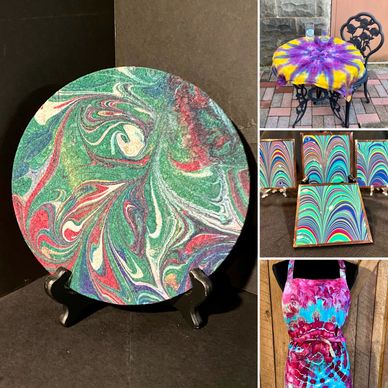 We offer so many colorful options for you and your home! Set your tables with hand marbled coasters and trivets. Make your kitchen a place of joy with our ice dyed aprons and cotton tea towels. We even have beautifully dyed Turkish towels and blankets.